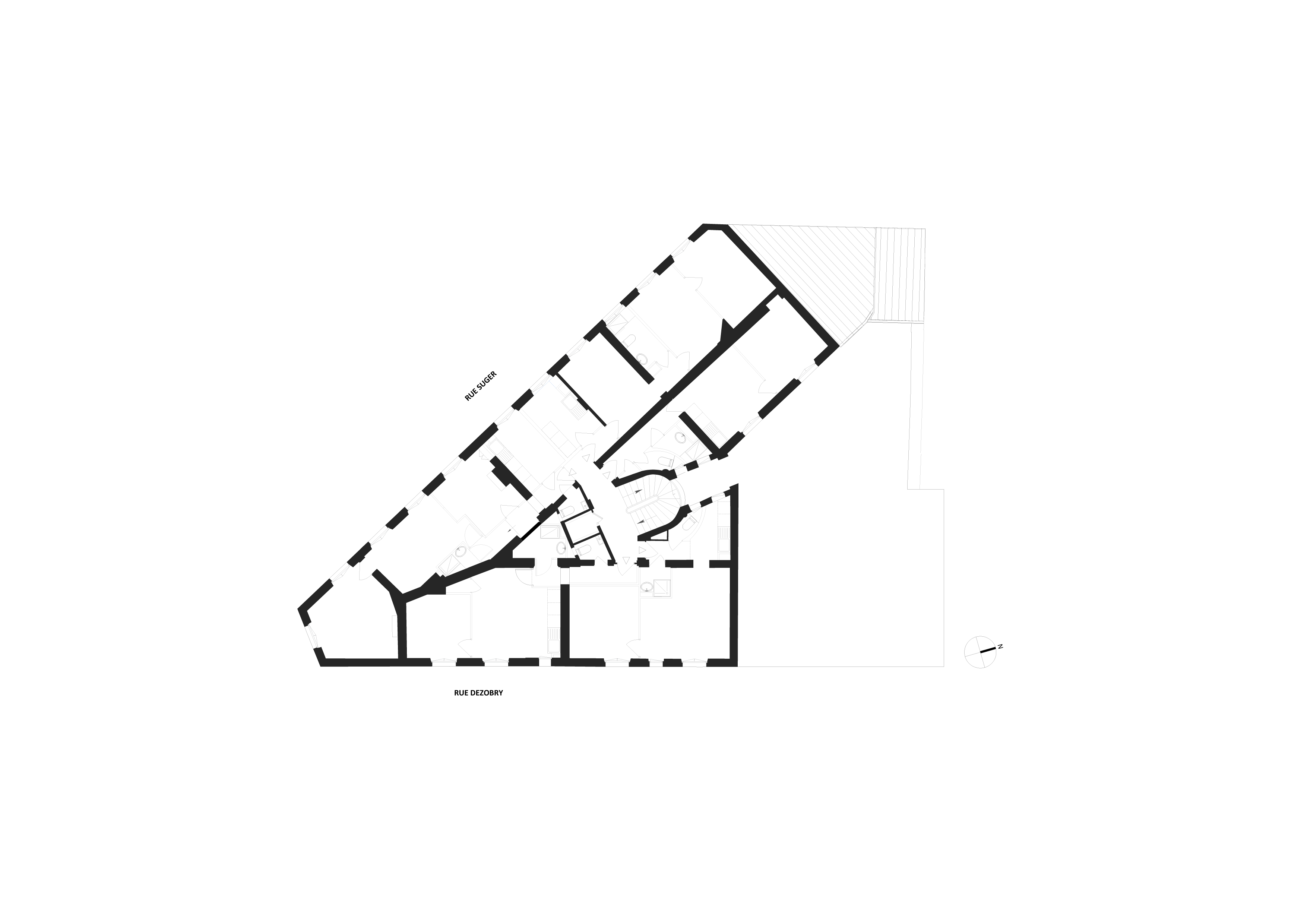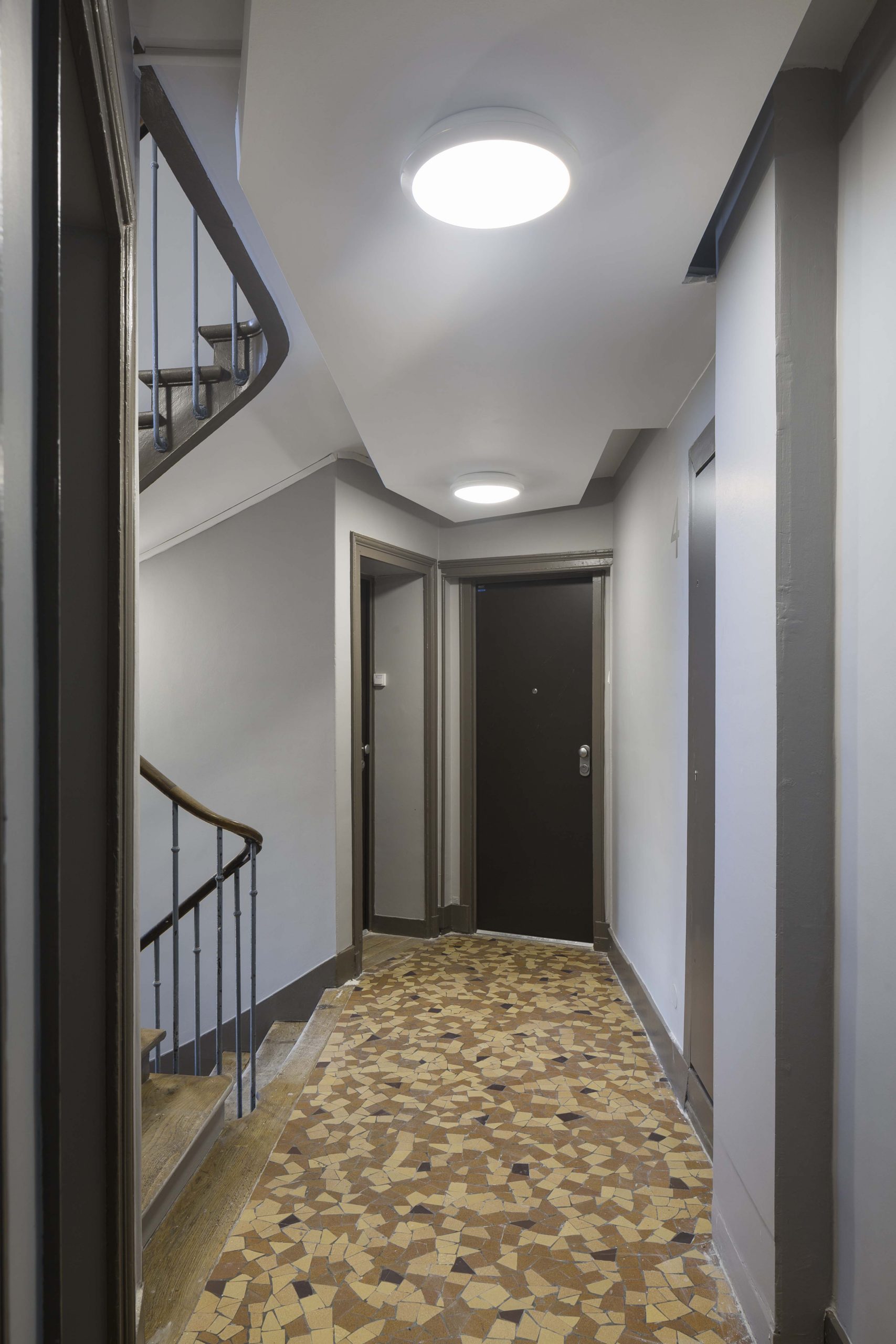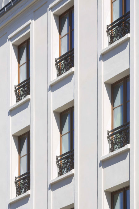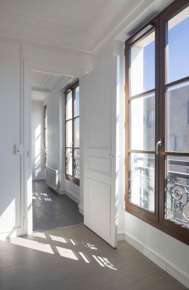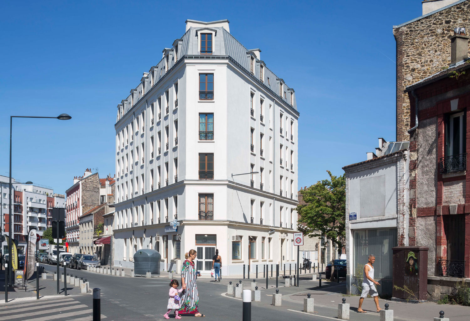 Situé à deux pas d’une église de Viollet-le-Duc dans le centre de Saint Denis, cet immeuble d’inspiration haussmannienne constitue la proue d’un petit ilot en pleine mutation. Les logements, très vétustes pour certains, ont été agrandis sur l’emprise de la courette existante au cœur du V que forme l’immeuble, afin de les doter de salles de bains et de sanitaires de dimensions correctes. La nécessaire réfection complète de la couverture a été l’occasion de réorganiser le dernier niveau. Si l’occupation des locaux et le caractère patrimonial de l’immeuble n’ont pas permis de viser de certification, le choix de menuiseries bois et d’un enduit chanvre et chaux en façade a permis d’augmenter considérablement les performances énergétiques de l’immeuble.