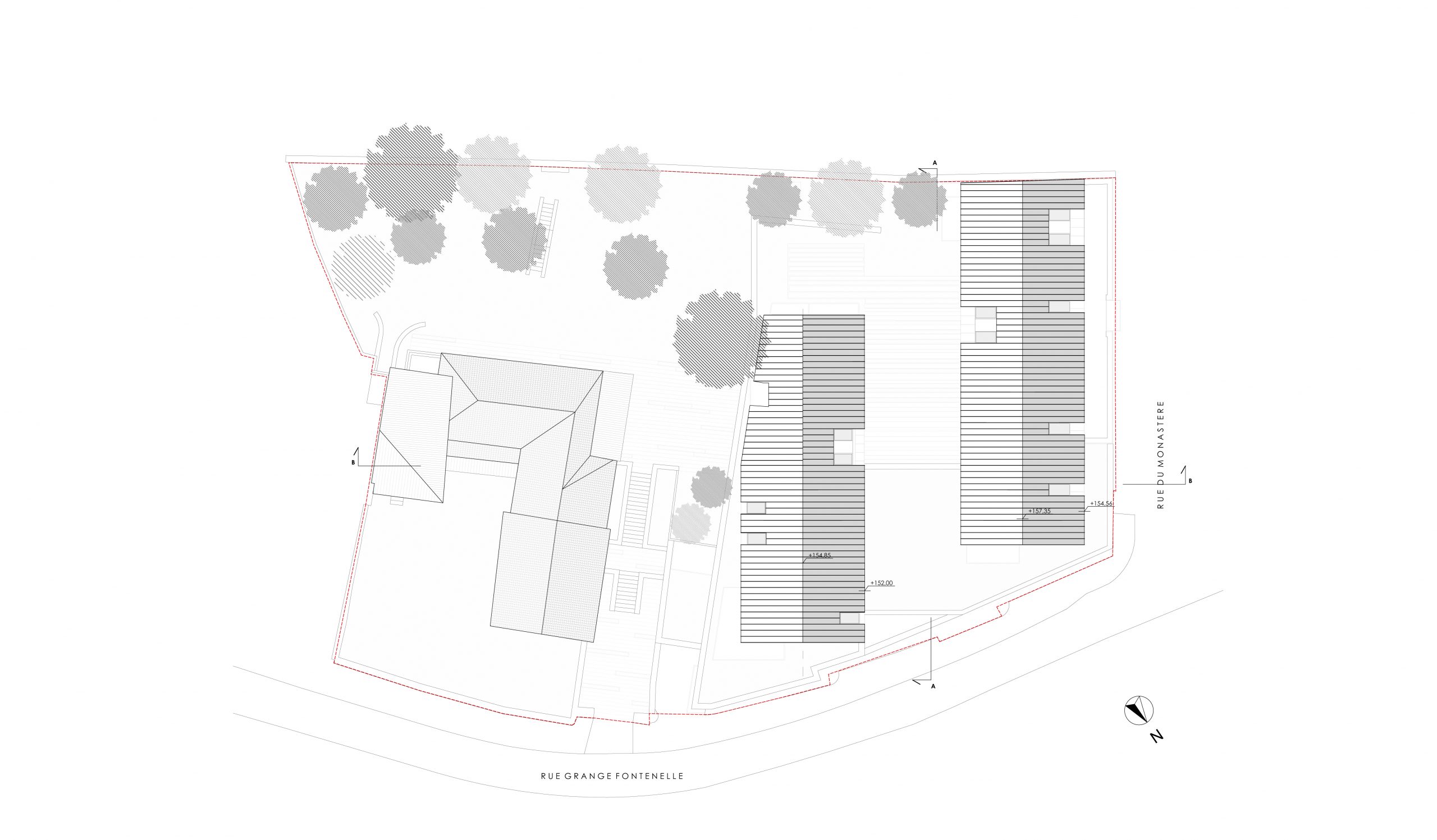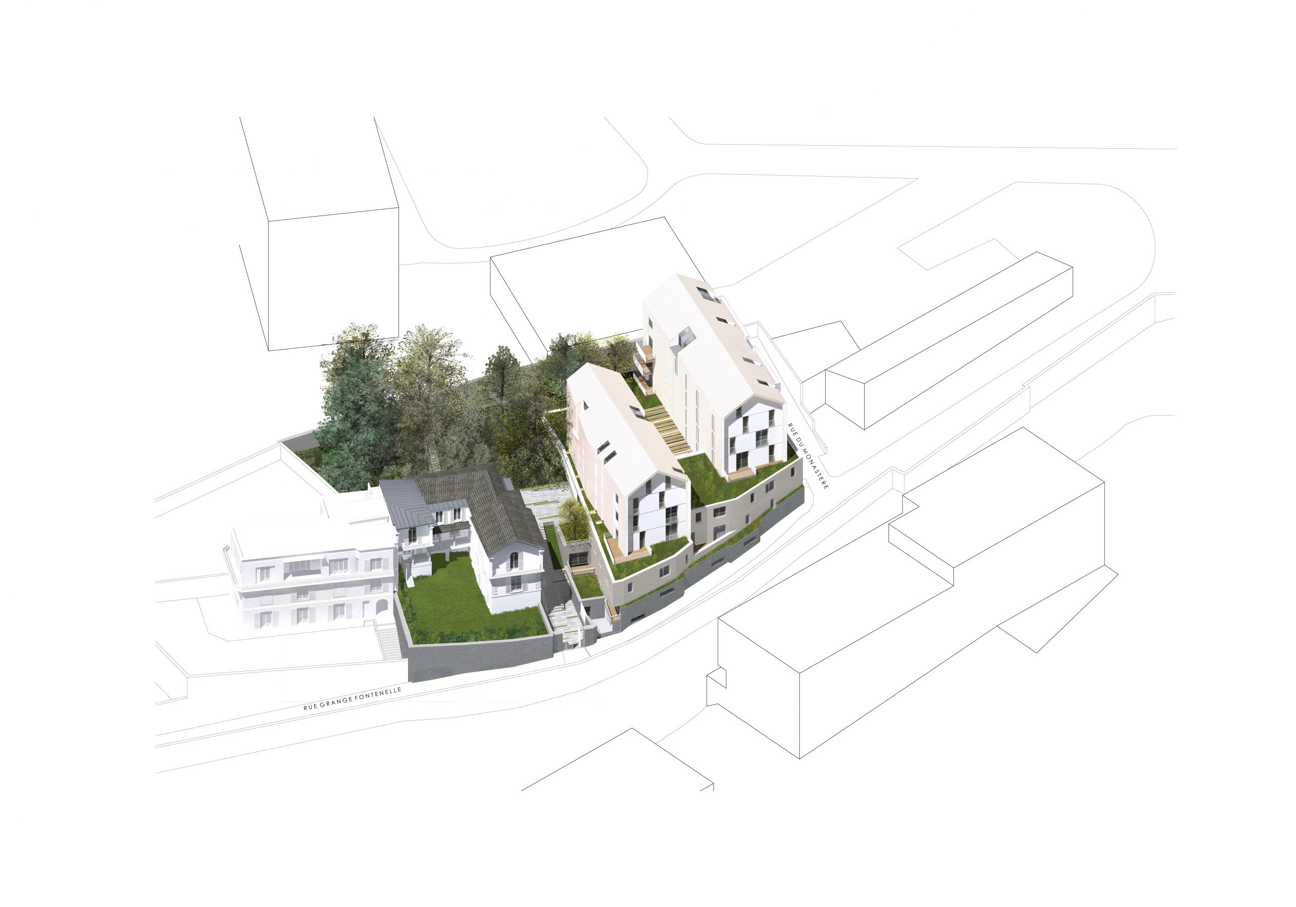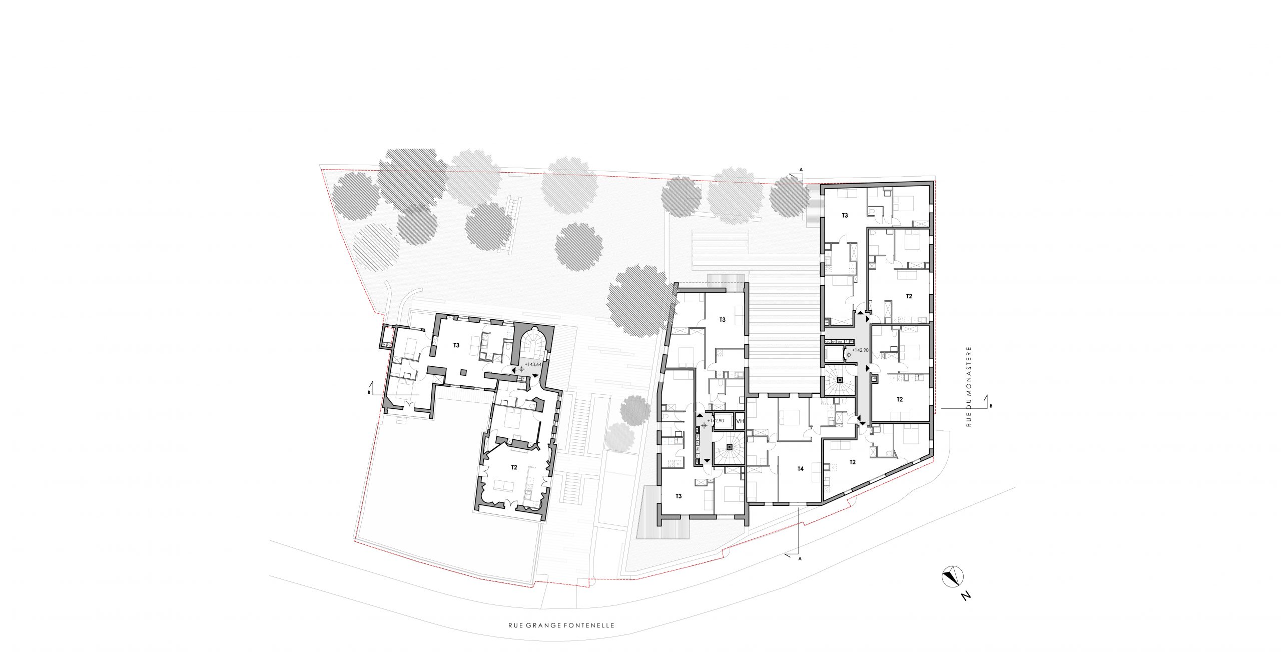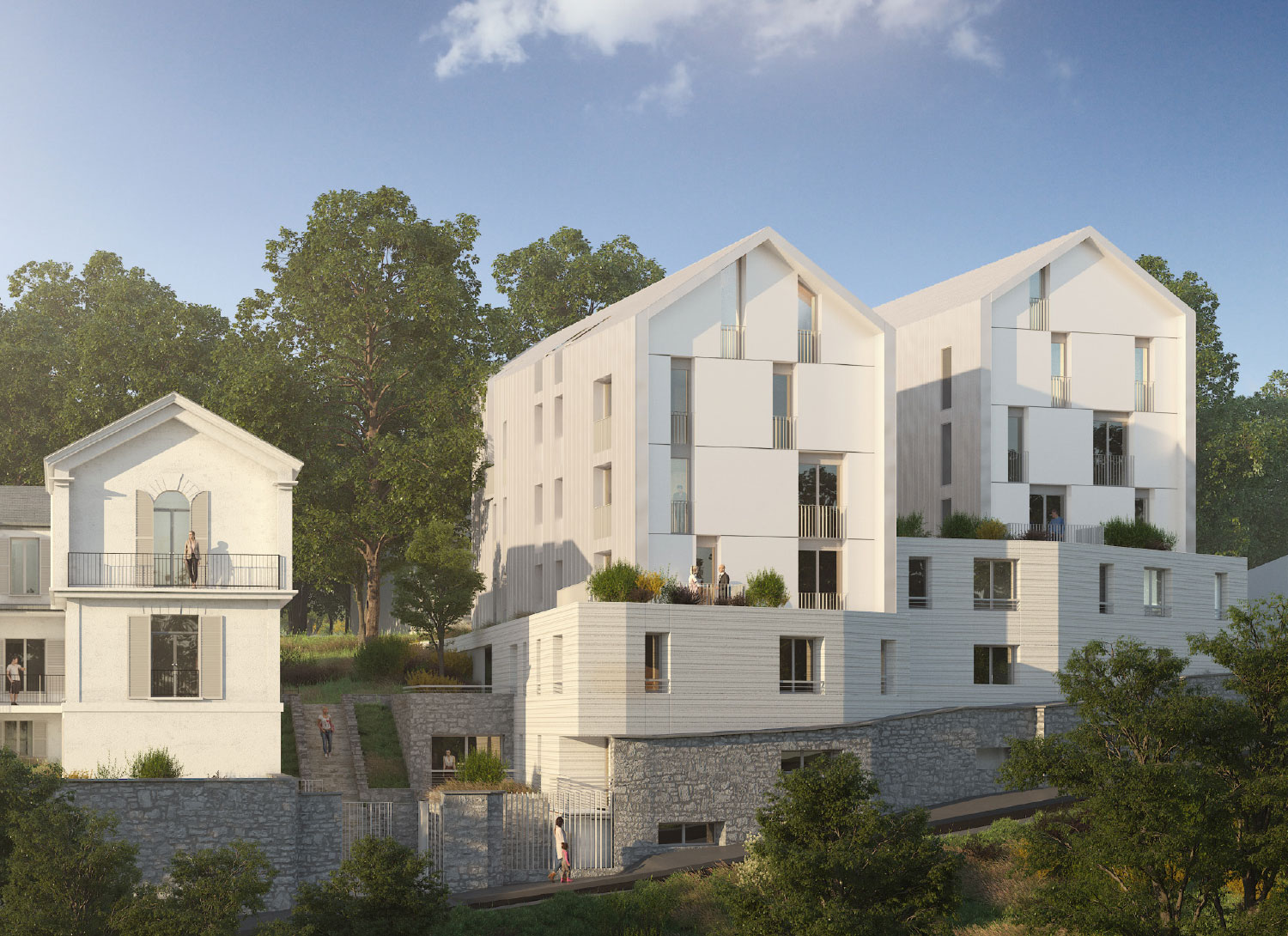 Restructuration d’une maison bourgeoise XIXè protégée au PLU et construction neuve sur la même parcelle, permettant de réaliser 30 à 35 logements sociaux et parkings associés.