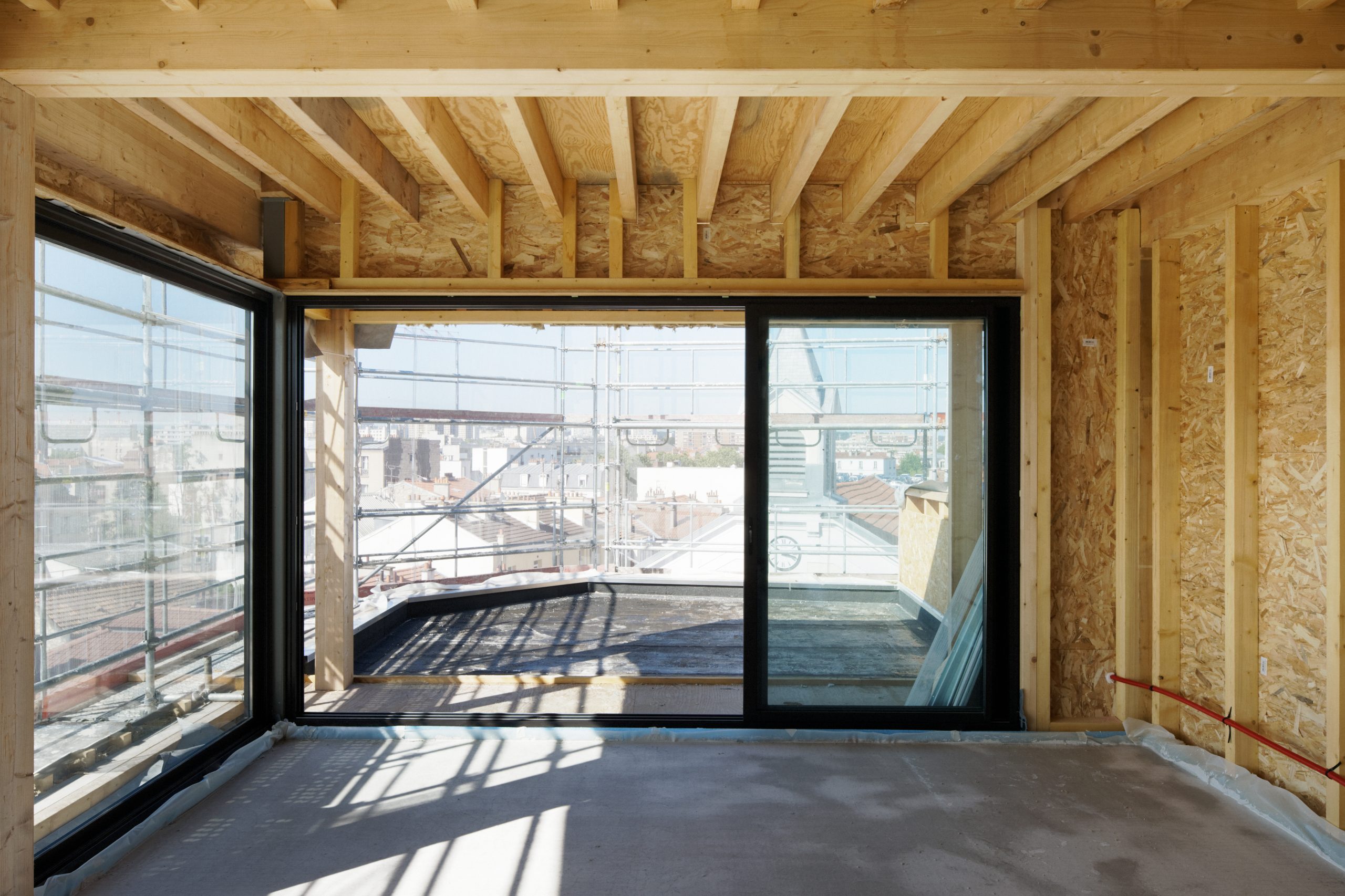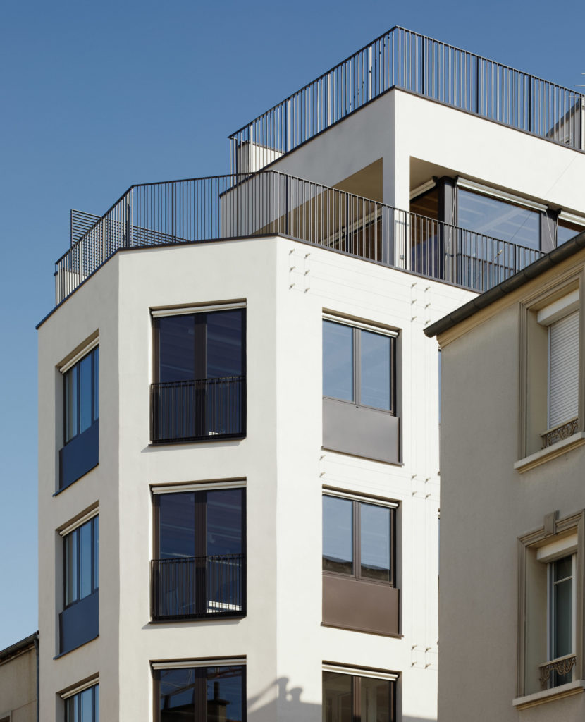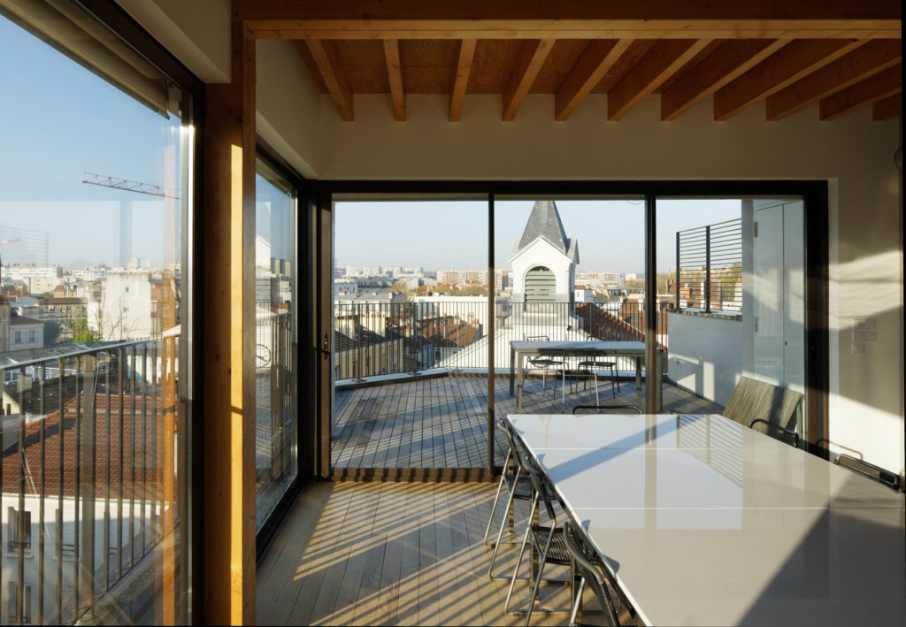 L’immeuble prend place sur une parcelle d’angle de 90 m² sur un axe commerçant du centre de Malakoff. Le rez-de-chaussée accueille un commerce avec vitrine en angle, le hall de l’immeuble et un local vélos. Au-dessus se développent 4 plateaux de bureaux, avec des espaces de confidentialité au droit des paliers d’escalier et d’ascenseur. Le 5ème plateau, formant attique de l’immeuble, est un étage commun comprenant salle de réunion – repas et cuisine, donnant sur une terrasse. Le roof-top accueille quant à lui une seconde terrasse et un potager urbain. Conçu dans une approche bioclimatique, l’immeuble est en ossature bois, avec une façade végétalisée par la mise en œuvre de câbles inox à partir d’une fosse de plantation sur rue.
