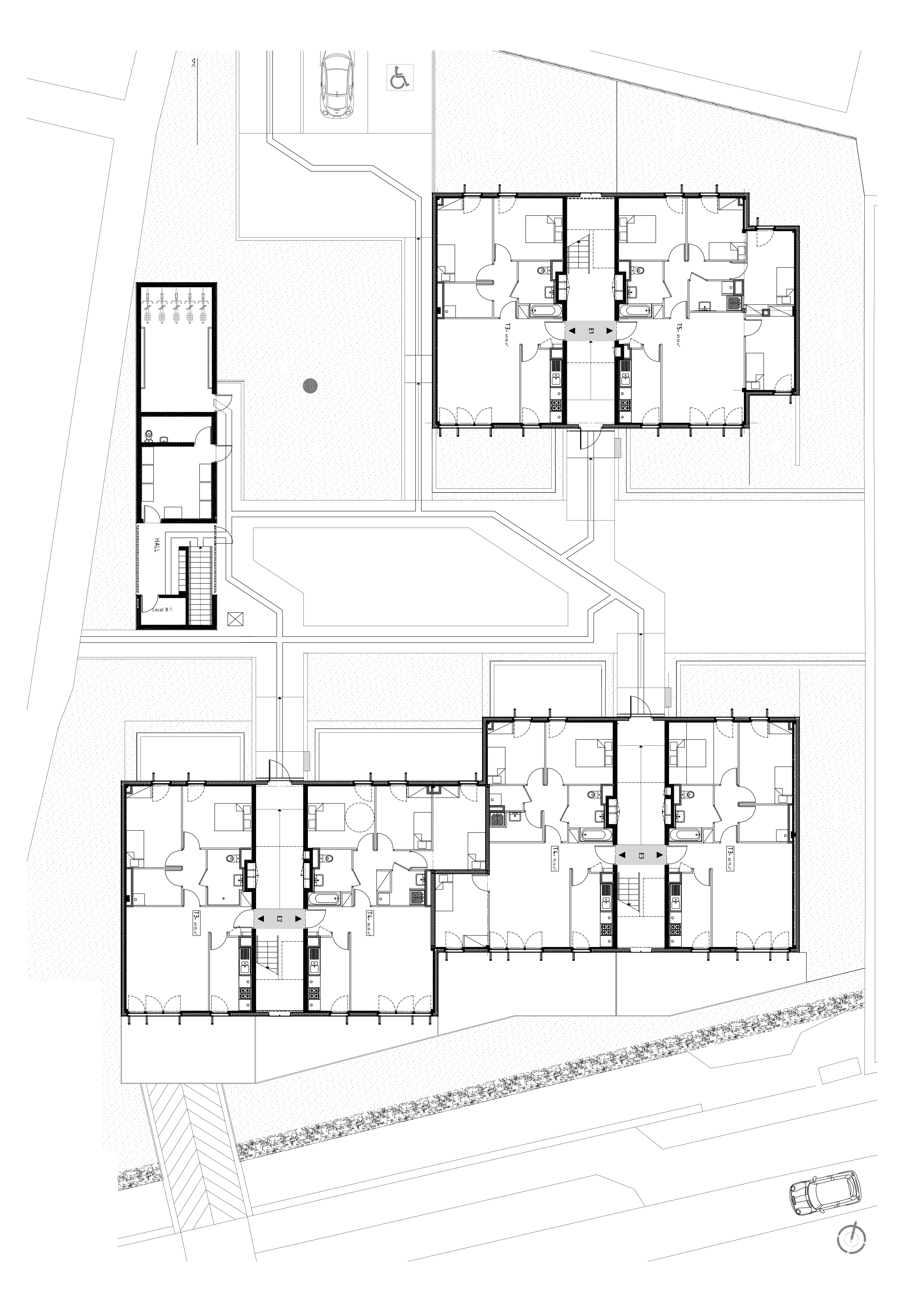 Elle s’inscrit dans une démarche expérimentale du bailleur, souhaitant créer sur le site une opération à ossature bois et une autre à ossature acier. La faible hauteur des bâtiments et leur implantation en limite de tissu pavillonnaire créent une transition d’échelle favorisant l’intégration dans le contexte urbain. Le projet s’inscrit dans la logique d’un toit à deux pentes accueillant des panneaux solaires côté sud, avec une écriture contemporaine des volumes et des matières.