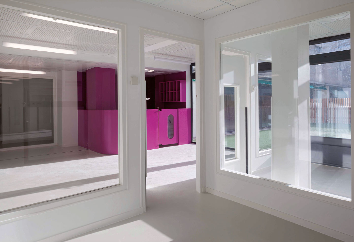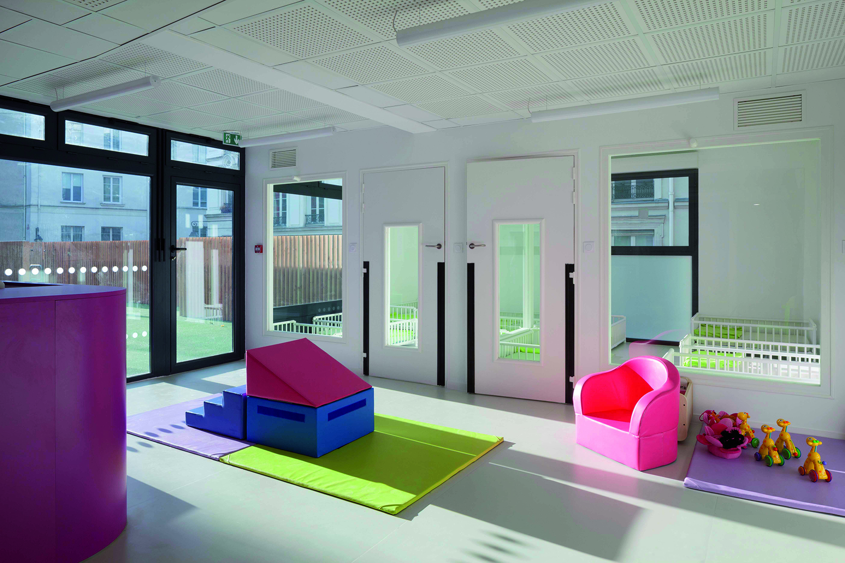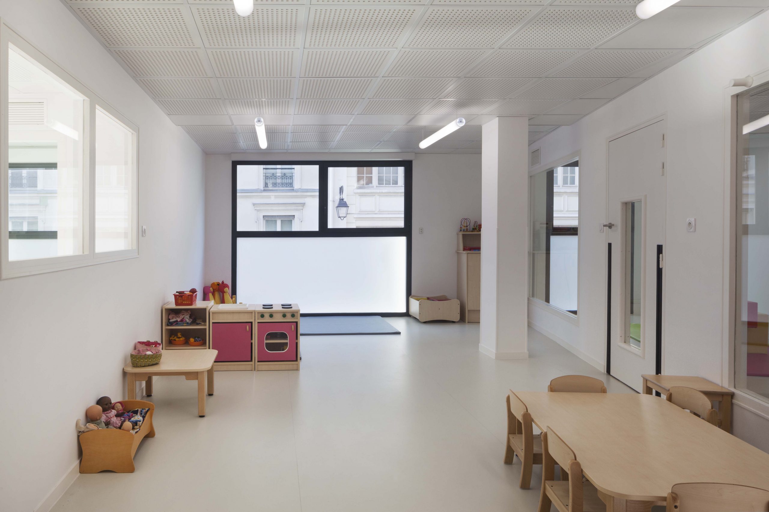 A l’intérieur, le déplacement de la circulation verticale libère des plateaux permettant de distribuer des locaux plus généreux. Les jeux de transparence de parois des salles d’éveil font circuler la lumière en profondeur, créant des espaces traversants qui développent les relations entre sections d’enfants, et éveillent à la situation dans l’espace. La luminosité est accentuée par le traitement blanc des intérieurs, ponctué de mobilier de couleur qui identifie les sections.