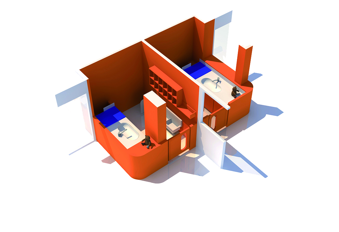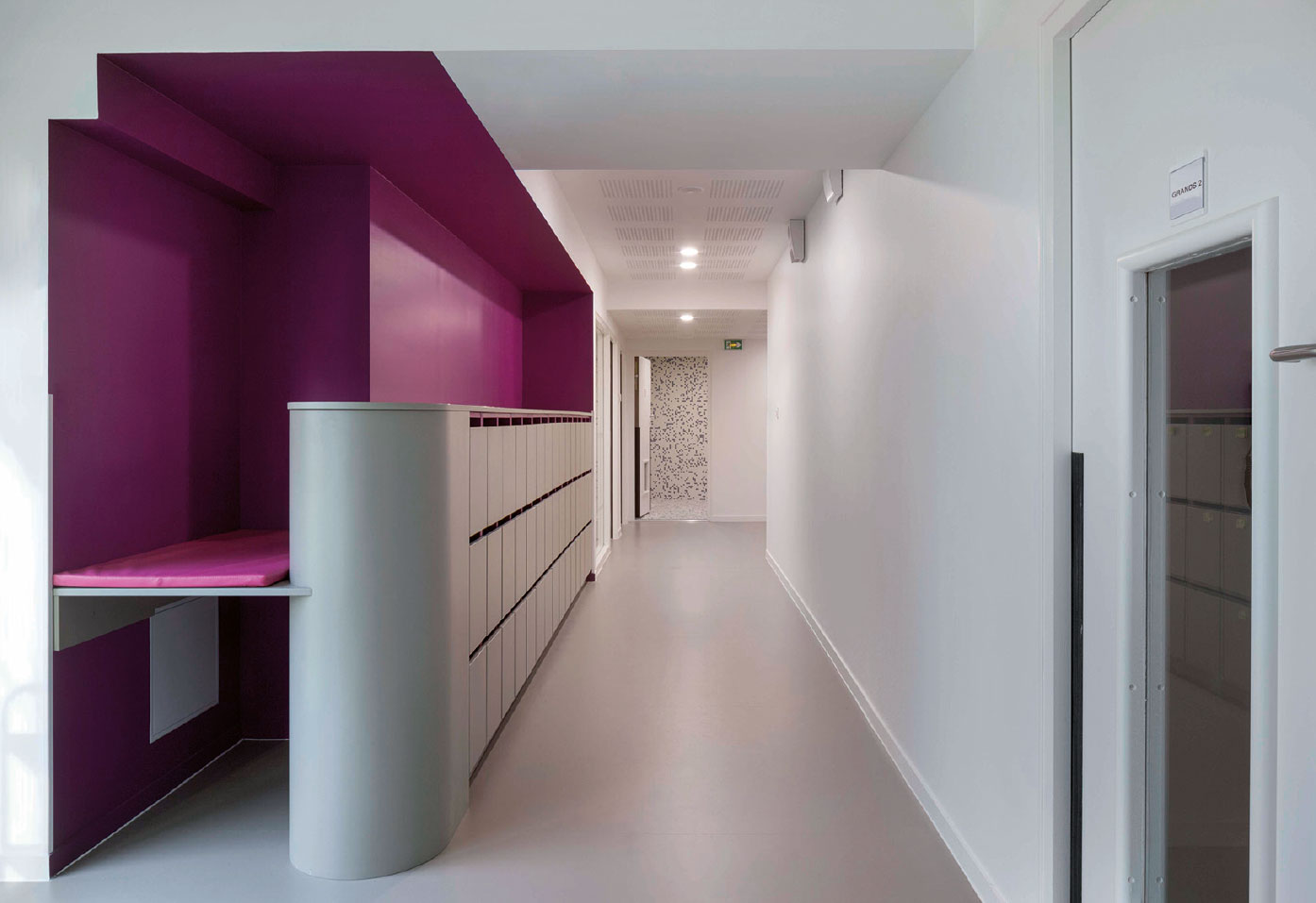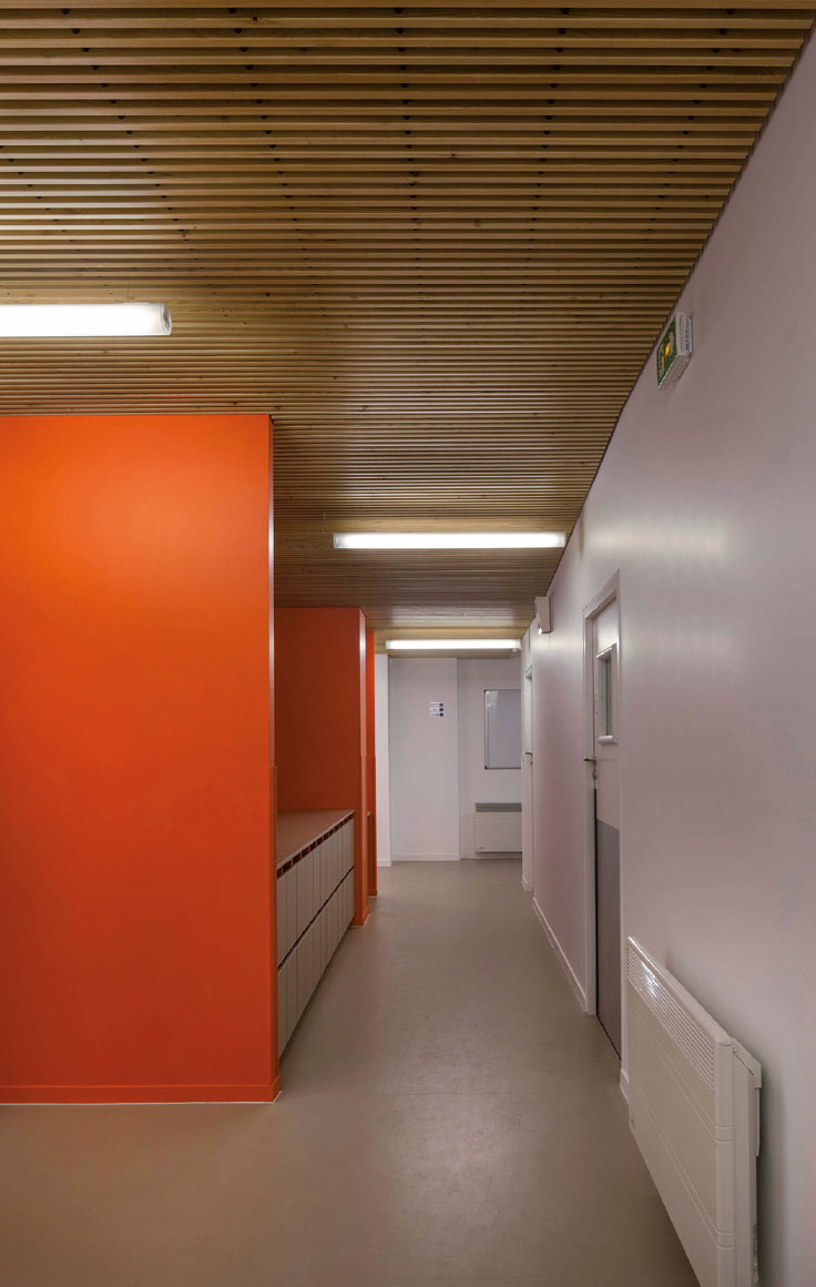 A l’intérieur, le déplacement de la circulation verticale libère des plateaux permettant de distribuer des locaux plus généreux. Les jeux de transparence de parois des salles d’éveil font circuler la lumière en profondeur, créant des espaces traversants qui développent les relations entre sections d’enfants, et éveillent à la situation dans l’espace. La luminosité est accentuée par le traitement blanc des intérieurs, ponctué de mobilier de couleur qui identifie les sections.