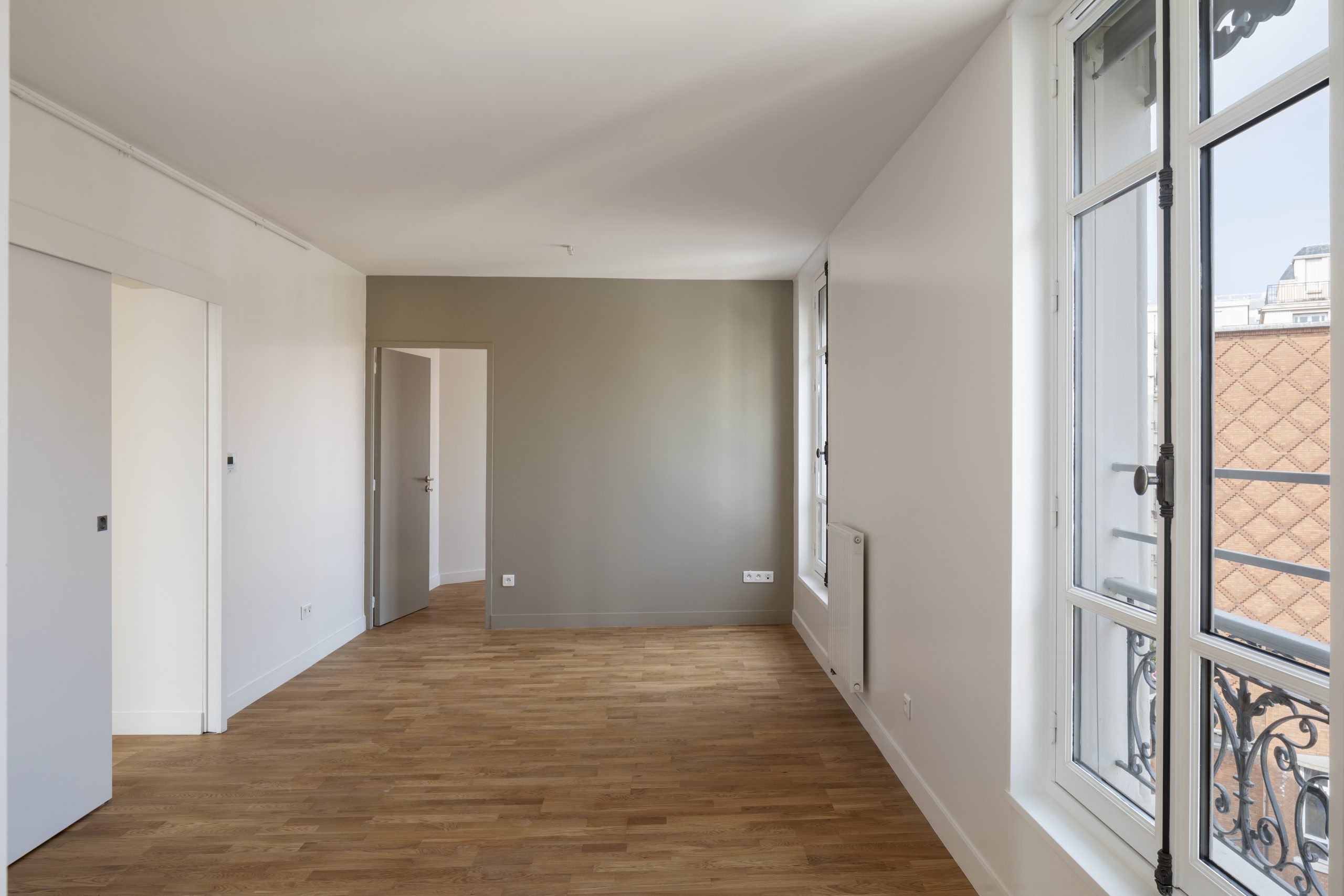 Le vocabulaire architectural faubourien a été restitué par la généralisation des lambrequins sur les fenêtres, qui dissimulent des stores d’occultation textiles, et le traitement simple des façades à la chaux blanche.