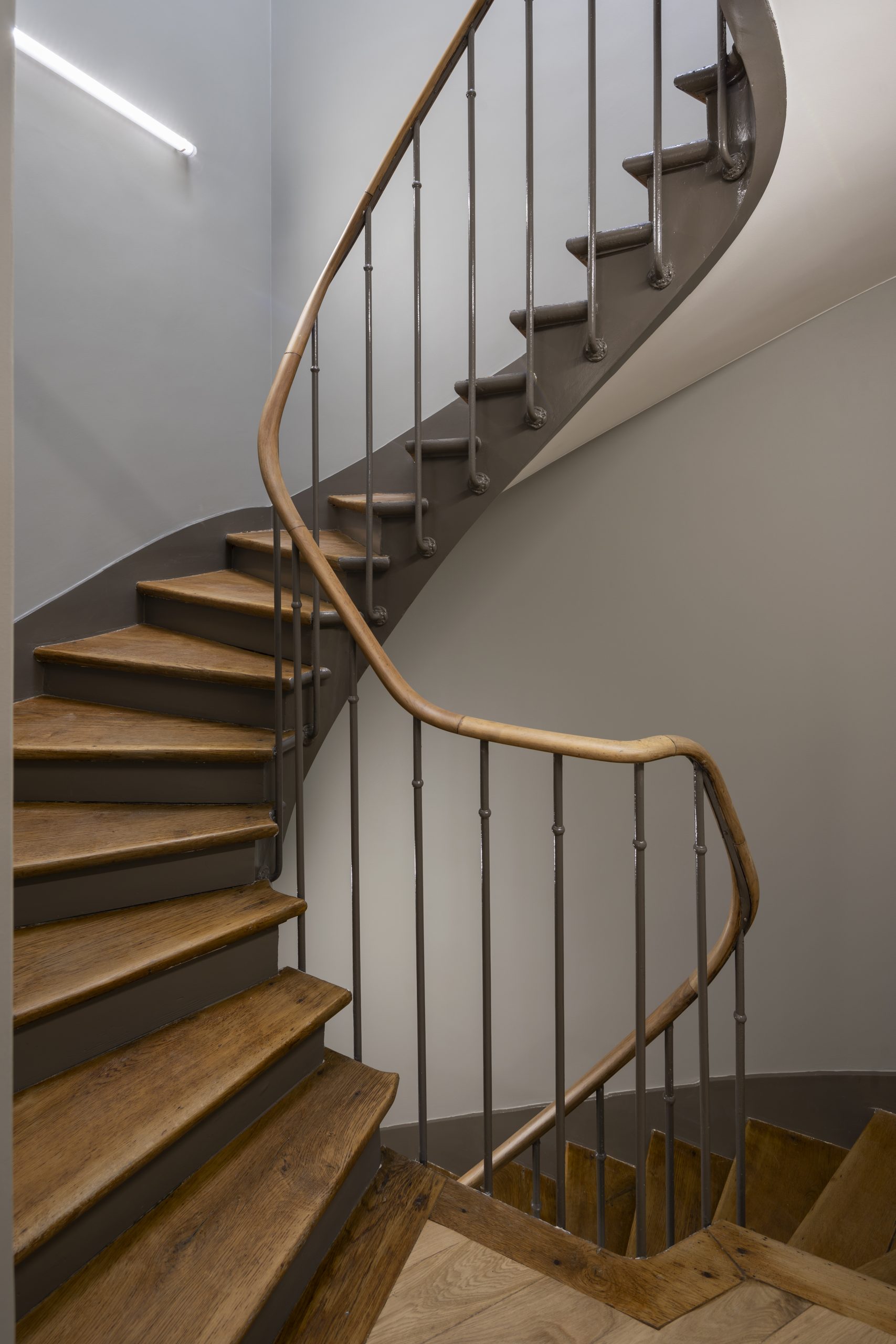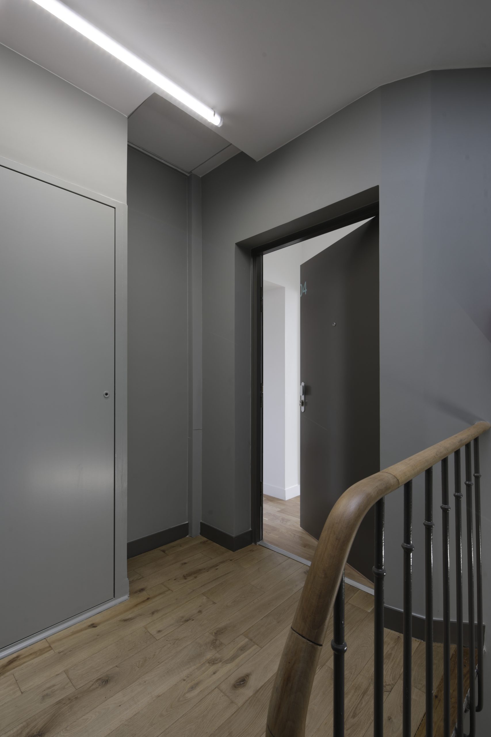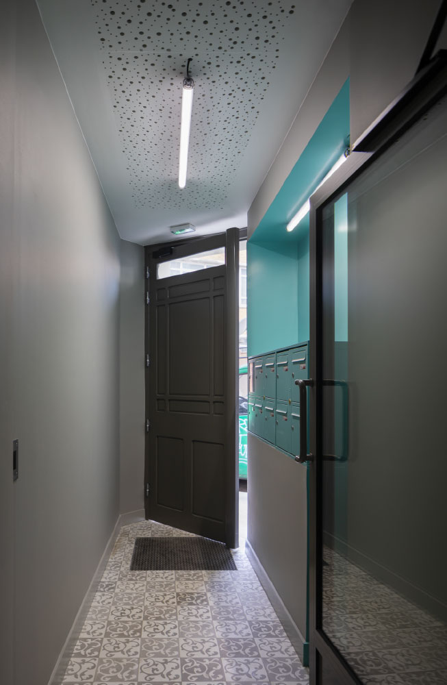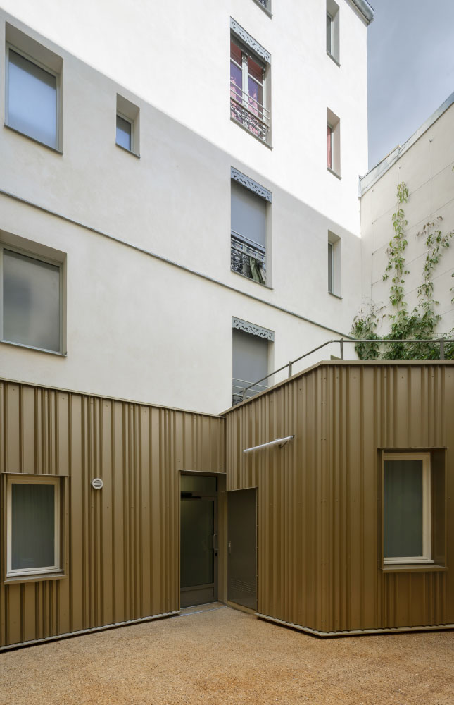 Il se conjugue avec une approche contemporaine des parties communes et de l’extension sur cour qui abrite les locaux communs : bardage acier aux reflets dorés, carreaux de ciment à motifs contemporains, choix des luminaires et des teintes.