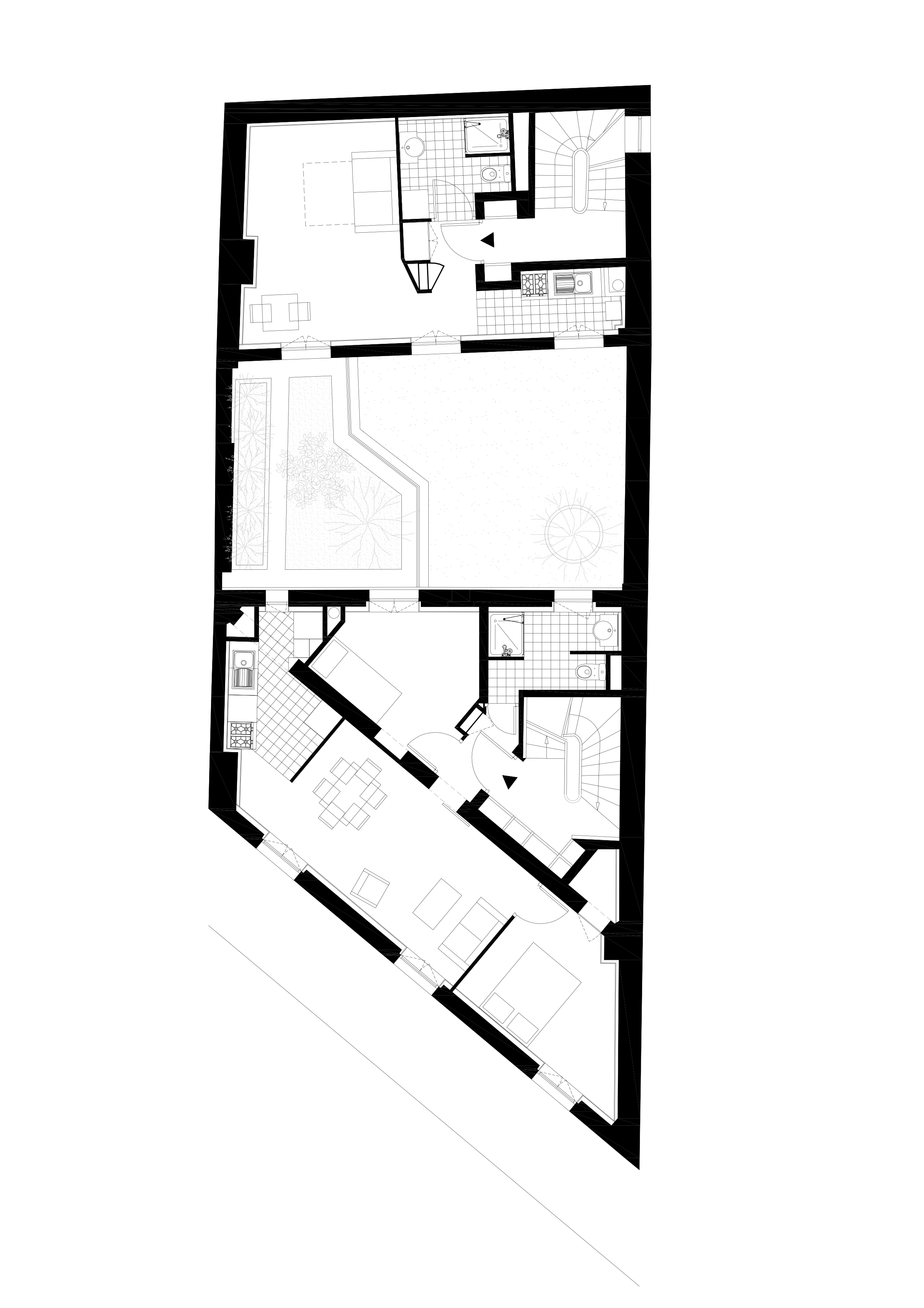 La parcelle accueillait deux petits bâtiments faubouriens, à R+4 sur rue et à R+3 en fond de cour, ainsi que deux commerces avec des arrière-boutiques en emprise sur la cour. La restructuration lourde a porté sur une réfection des planchers (en ossature bois côté rue et en planchers collaborants sur cour), et un curage des arrière-boutiques.